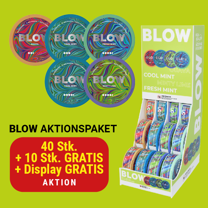 Mit dem BLOW Nicopouches Aktions-Paket sichern Sie sich ein unschlagbares Angebot: 40 Dosen Nikotin Pouches bestellen, 10 Dosen GRATIS dazu erhalten – und ein Verkaufsdisplay gratis obendrauf. Ideal für die aufmerksamkeitsstarke Präsentation am Point of Sale und maximale Verkaufschancen.
