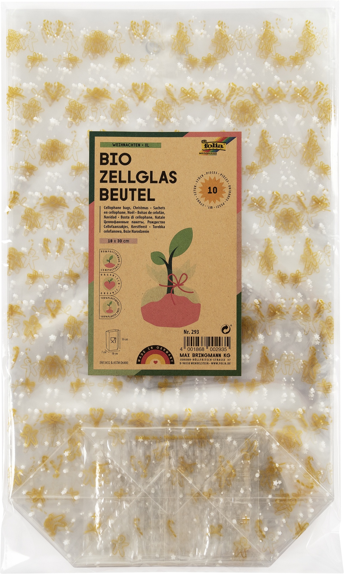 10er Zellglasbeutel mit Weihnachtsoptik von Folia.  Goldener Weihnachtsdruck auf BIO-Folie (aus nachwachsbaren Rohstoffen hergestellt, kompostierbar).