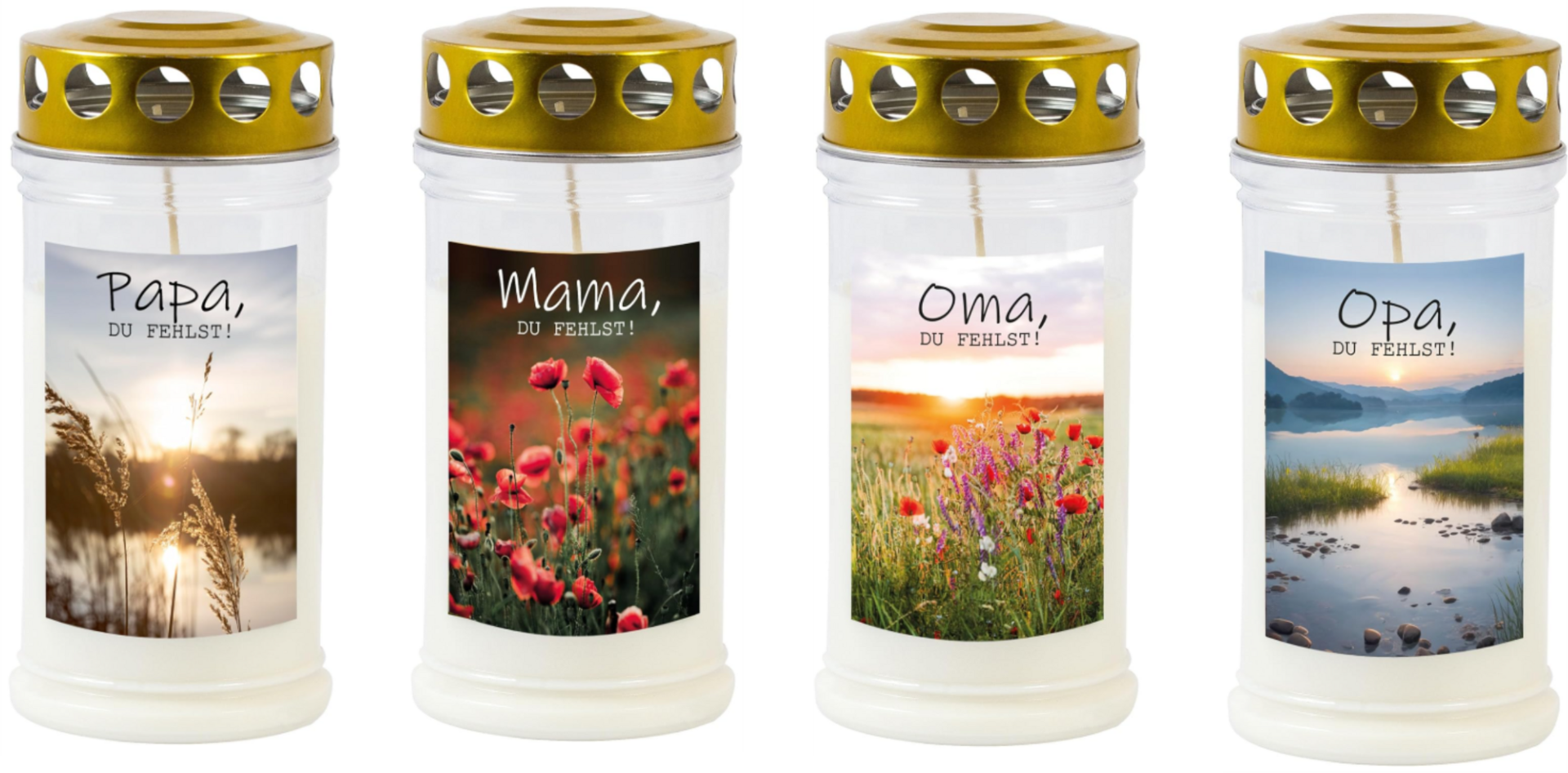 Die JEKA Gedenkkerze in vier unterschiedlichen Motiven (Papa, Mama, Oma, Opa) ist eine hochwertige Grab- und Gedenkkerze für würdige Momente des Innehaltens. Mit einer Brenndauer von ca. 4 Tagen und einer Größe von 17 × 7,5 cm eignet sie sich ideal für Friedhof, Grabstätte oder persönliche Gedenkorte.